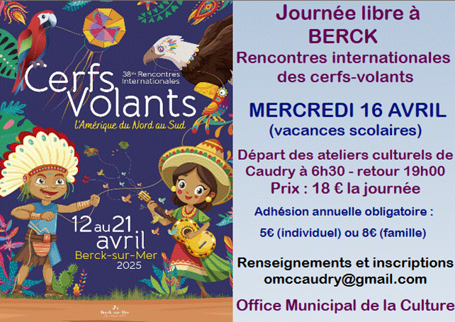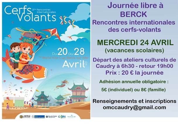 - Journée libre à BERCK rencontres internationales des cerfs-volants le MERCREDI 22 AVRIL 2026 (vacances scolaires)